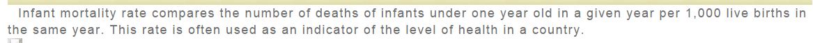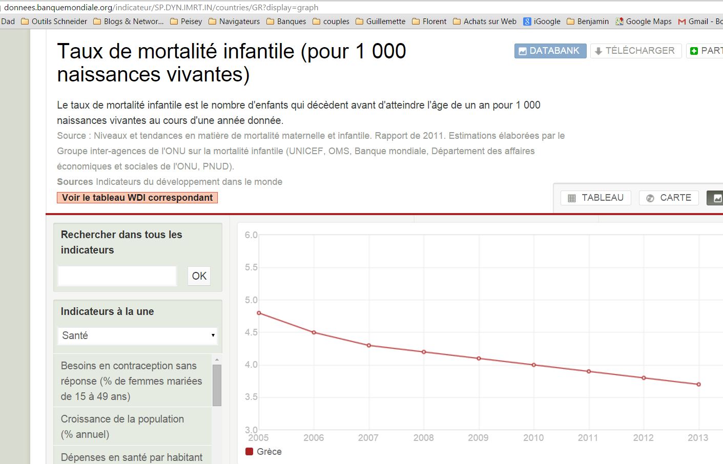 * Vous aurez bien sûr noté que la banque mondiale mesure le nombre de décès avant l’âge de 1 an des enfants nés dans une année , alors que la CIA rapporte le nombre de décès d’enfants de moins de 1 an au nombre de naissances dans la même année. Si la natalité baisse une année, cela fait monter le ratio même si la mortalité ne bouge pas…