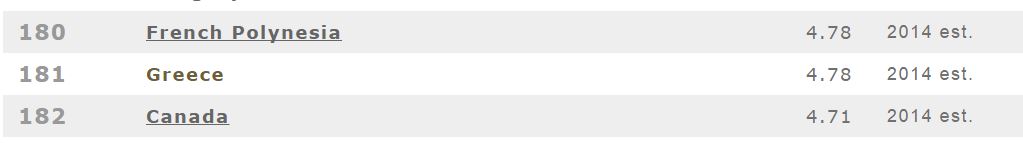 Du coup, je vais voir LA bible : le CIA Factbook … qui, lui , a le chiffre 2014 …. qui ne correspond pas à la même mesure que les précédents*, mais rappelle à Mme Duflot qu’elle pourrait peut être s’occuper de la Polynésie Française avant de donner des leçons.