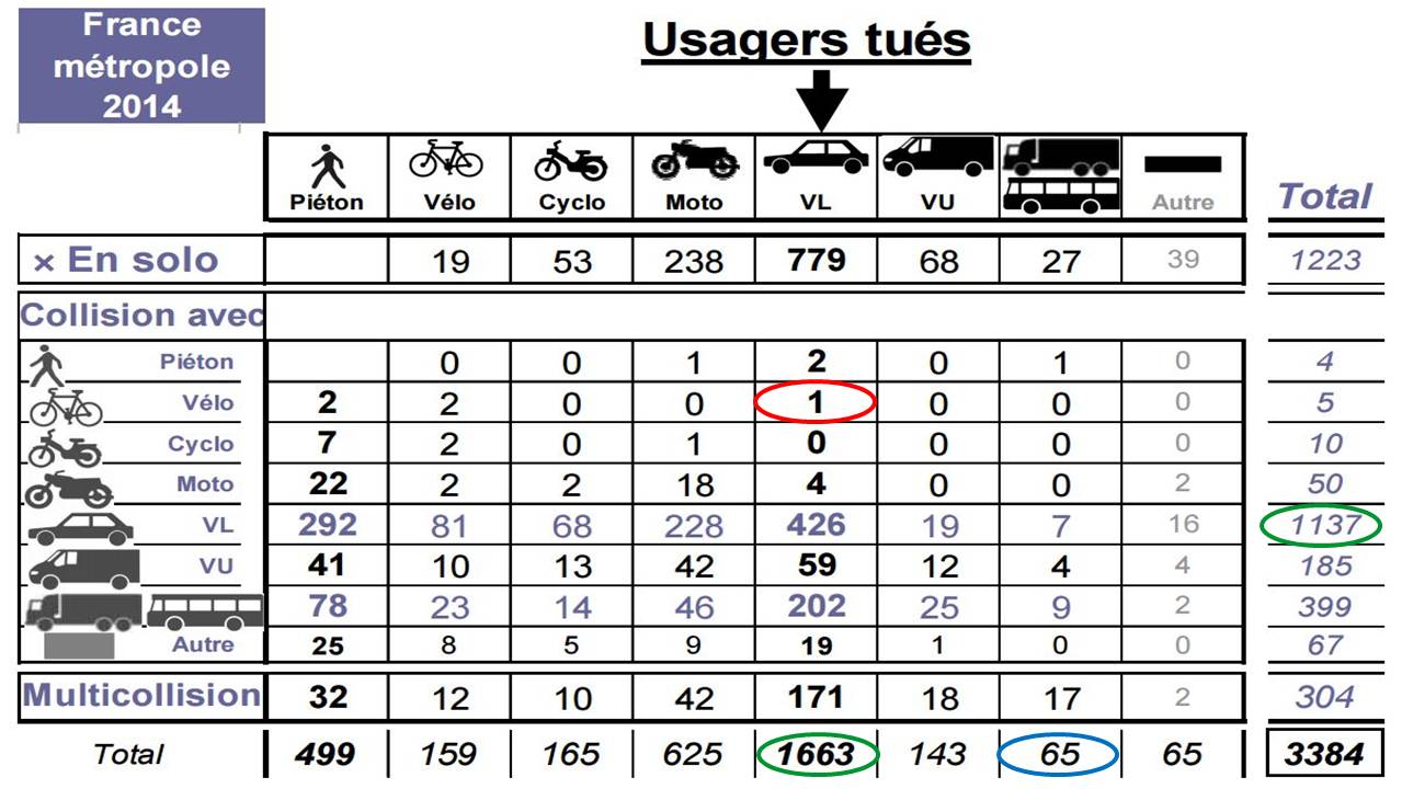 Intéressant, quoique morbide, ce tableau du bilan de la coexistence routière. On y voit que les automobilistes ( comme les cyclistes) sont plus tués qu’ils ne tuent, sur la route du moins (cercles verts). Qu’il y a en France dix fois plus**** plus d’ours sauvages que de vélos tueurs de grand mères.