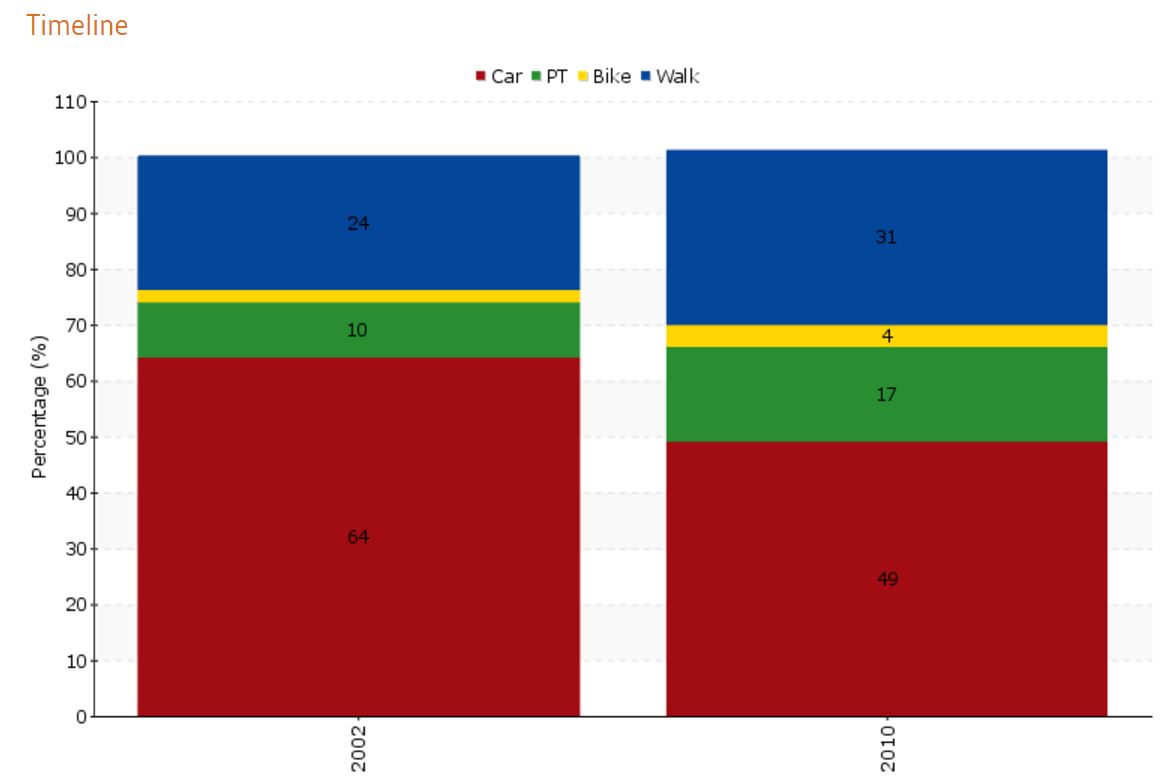 Sommes nous aux 10% ? L’ EPOMM** a des données pas trop à jour, mais qui confirment que Grenoble évolue .De 2002 à 2010, la part du vélo, comme d’ailleurs celle des transports en commun, aurait quasi doublé. Evolution impressionnante en huit années seulement. une belle preuve de la capacité d’adaptation de l’homme.