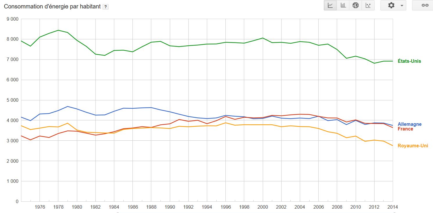 2 – En 10 ans, la consommation d’énergie primaire par habitant a baissé de 15% en France. De 25% en Angleterre, ou elle est revenue au niveau des années 70. Les technologies sont là, la conscience aussi.