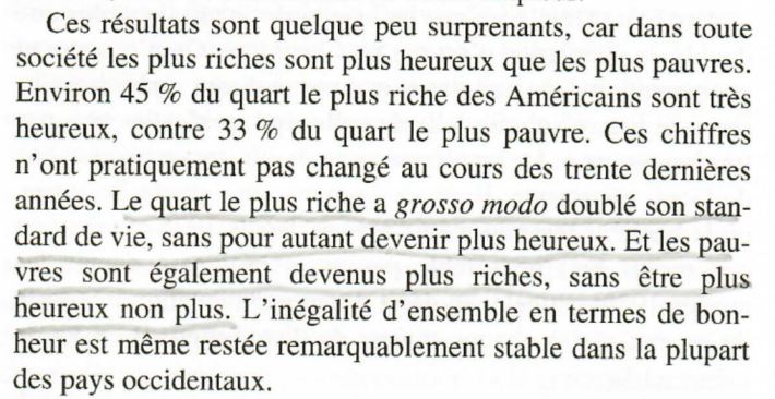 Mon livre de chevet favori (bon, c’est vrai il n’est pas seul, la pile à mon chevet menace parfois sérieusement mon sommeil) , j’ai nommé “le prix du bonheur”** , m’indique bien que depuis quarante ans le pouvoir d’achat a eu beau doubler, le bonheur des riches comme celui des pauvres n’a pas augmenté d’un poil ( voir fig et son commentaire ci dessous).