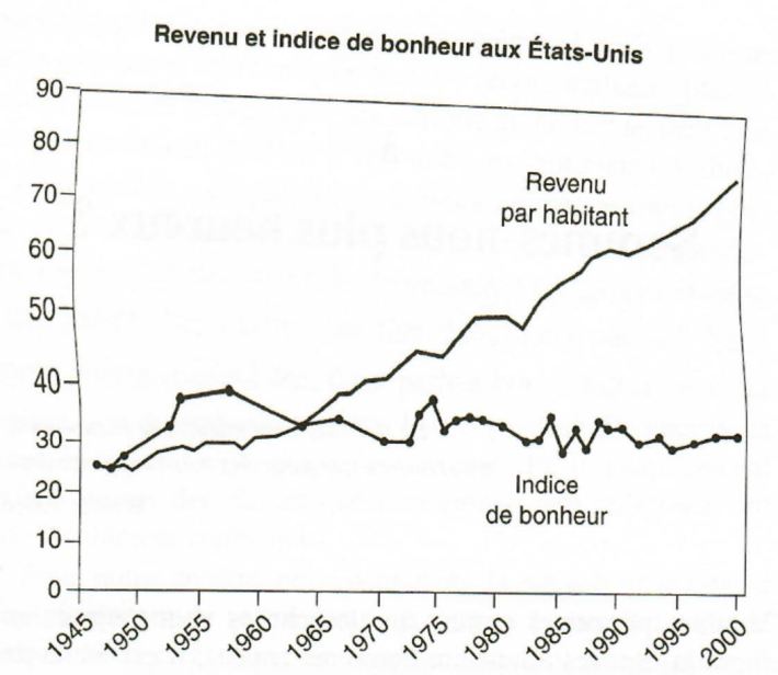 Mon livre de chevet favori (bon, c’est vrai il n’est pas seul, la pile à mon chevet menace parfois sérieusement mon sommeil) , j’ai nommé “le prix du bonheur”** , m’indique bien que depuis quarante ans le pouvoir d’achat a eu beau doubler, le bonheur des riches comme celui des pauvres n’a pas augmenté d’un poil ( voir fig et son commentaire ci dessous).