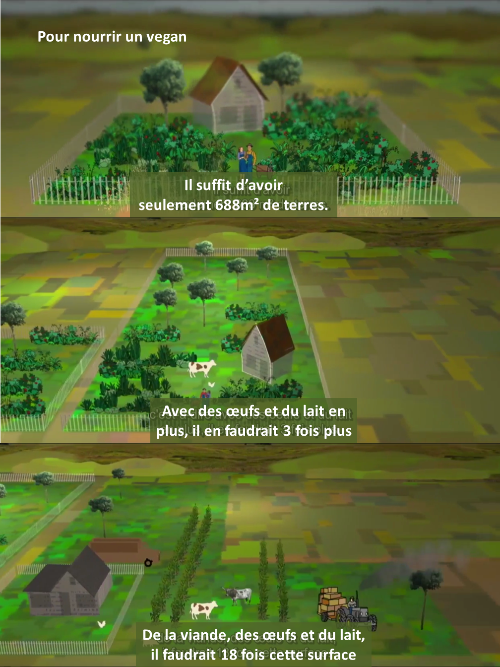 Il en faut 100 fois plus, soit 70 000 m², pour donner le même 1,4 kg de protéines animales (viande, laitage) à un carnivore intégral.