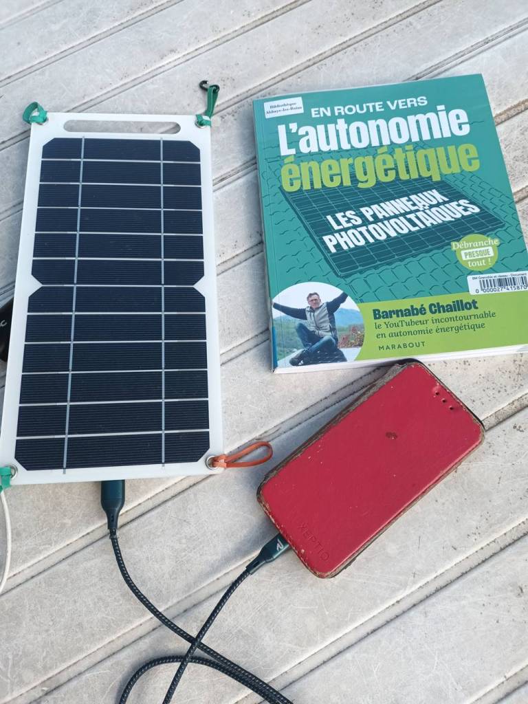 Bref, je me suis mis en tête de charger mon téléphone via ce panneau. Directement, ou par l’intermédiaire d’une batterie, cadeau publicitaire reçu lors d’un séminaire et qui dort dans un tiroir depuis. Combien de bijoux technologiques dorment dans mes tiroirs !!