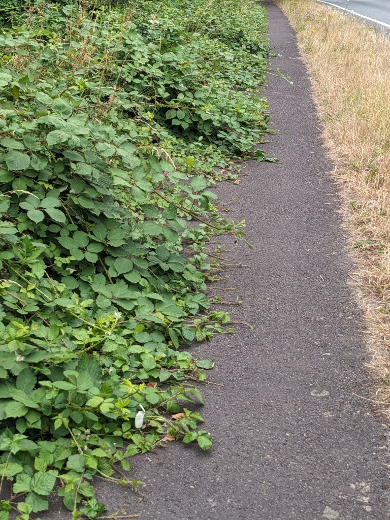 Le marquage des itinéraires, lui, laisse à désirer. De signe eurovélo, que nenni. La fameuse Eurovélo1 , que nous imaginions parcourue de hordes de cyclotouristes européens, a semble t il bien souffert du Brexit. Par endroits, une piste dédiée a bien été créée, sans doute sous financement européen. Comme on le voit sur cette photo, elle n’est plus fréquentable que par ceux qui ne craignent pas les crevaisons, recouvertes de ronces sauf une bande d’une vingtaine de centimètres pour poser ses pneumatiques.